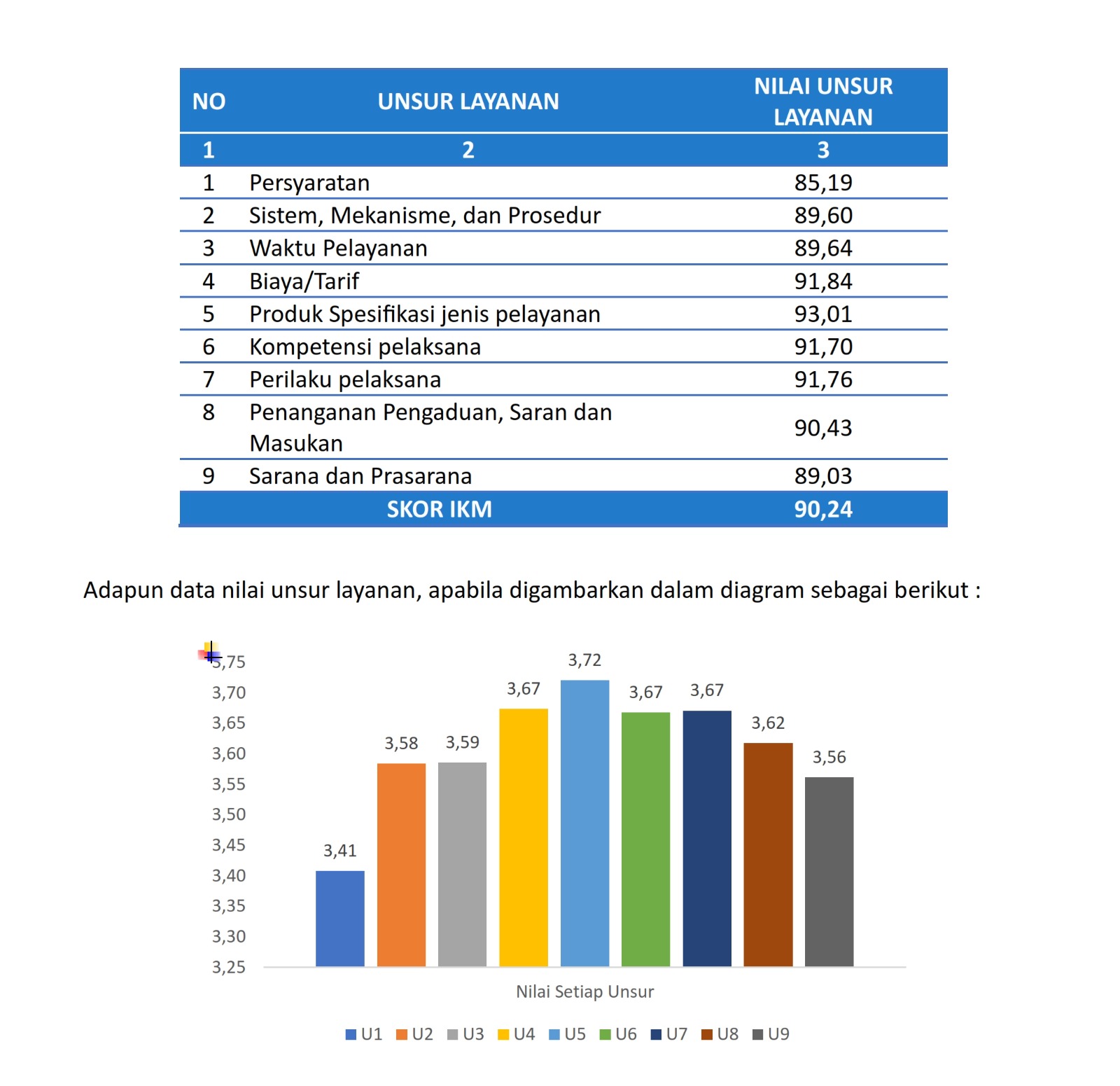 Indeks Kepuasan Masyarakat (IKM) merupakan salah satu indikator yang digunakan untuk mengukur keberhasilan penyelenggaraan pelayanan publik. Nilai IKM diperoleh dari hasil Survey Kepuasan Masyarakat (SKM) yang dalam pelaksanaannya berpedoman pada Peraturan Menteri Pendayagunaan Aparatur Negara dan Reformasi Birokrasi Nomor 14 Tahun 2017 tentang Pedoman Penyusunan Survey Kepuasan Masyarakat Unit Penyelenggara Pelayanan Publik. Pelaksanaan SKM pada Inspektorat Daerah Kota Bogor Kota Bogor dilaksanakan secara langsung pada 36 (tiga puluh enam) Perangkat Daerah di lingkungan Pemerintah Kota Bogor dengan menggunakan metode kuesioner SKM. Kuesioner sebagaimana dimaksud memuat 25 (Dua Puluh Lima) pertanyaan terkait dengan 9 (Sembilan) unsur pelayanan yang menjadi Indikator Kepuasan Masyarakat, hasil pengolahan data kuisioner SKM Final pada Inspektorat Daerah Kota Bogor Kota Bogor Tahun 2025 menunjukkan bahwa tingkat kepuasan masyarakat terhadap penyelenggaraan pelayanan publik pada Inspektorat Daerah Kota Bogor Kota Bogor adalah “Sangat Baik”. Hal ini ditunjukkan oleh nilai Indeks Kepuasan Masyarakat setelah dikonversi adalah sebesar 90,24. Unsur pelayanan yang memiliki nilai rata-rata tertinggi dengan mutu pelayanan “sangat baik” terdapat pada Unsur Produk Spesifikasi Jenis Pelayanan dengan Nilai Interval Konversi sebesar 93,01, Unsur Biaya/Tarif dengan Nilai Interval Konversi sebesar 91,84, Unsur Perilaku Pelaksana dengan Nilai Konversi sebesar 91,76, Unsur Kompetensi Pelaksana dengan Nilai Interval Konversi sebesar 91,70, Unsur Penanganan Pengaduan, Saran dan Masukan dengan Nilai Interval Konversi sebesar 90,43, Unsur Waktu Pelayanan dengan Nilai Interval Konversi sebesar 89,64, Unsur Sistem, Mekanisme dan Prosedur dengan Nilai Interval Konversi sebesar 89,60, Unsur Sarana dan Prasarana dengan Nilai Interval Konversi sebesar 89,03 dan Unsur Persyaratan dengan Nilai Interval Konversi sebesar 85,19. Apabila dilihat dari keseluruhan Nilai Interval Konversi, Unsur Persyaratan memiliki nilai terendah, hal tersebut perlu dijadikan rekomendasi tindak lanjut dalam membangun kualitas pelayanan Inspektorat Daerah Kota Bogor berikutnya.